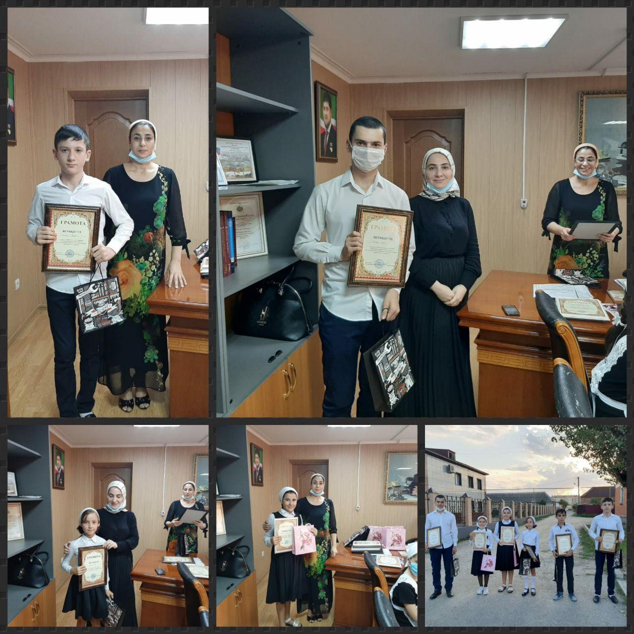 01.09.2020Учащиеся школы Батаев Ваха, Эзирханова Иман, Эзирханов Рамзан, Мусаев Арби, Идрисова Альбика, Умакаев Рамзан и Ахматова Силана награждены грамотами Департамента образования г. Аргун за участие в конкурсе на лучший видеоролик "Герой нашего времени", посвящённом 69 -ой годовщине со дня рождения Первого Президента, Героя России Ахмат-Хаджи Кадырова.