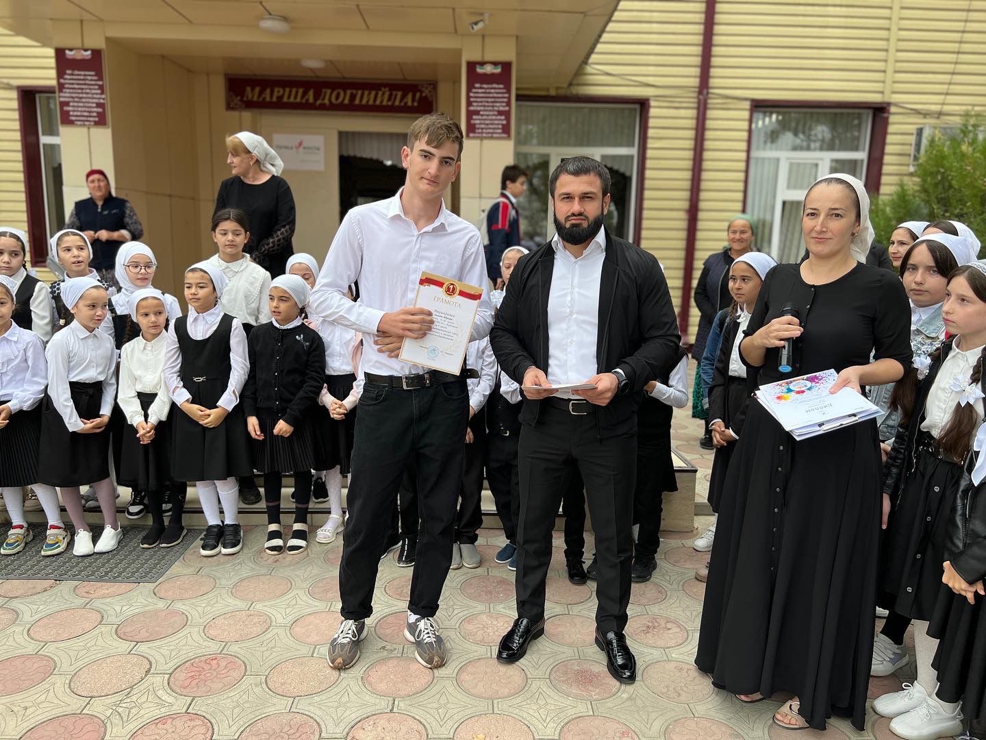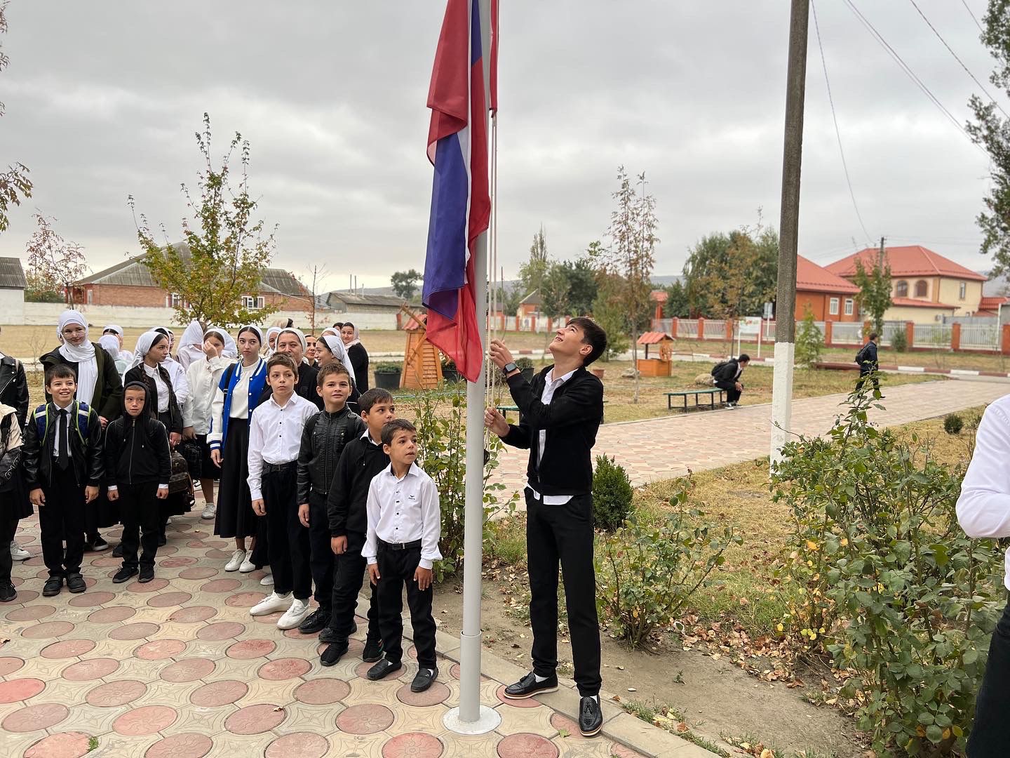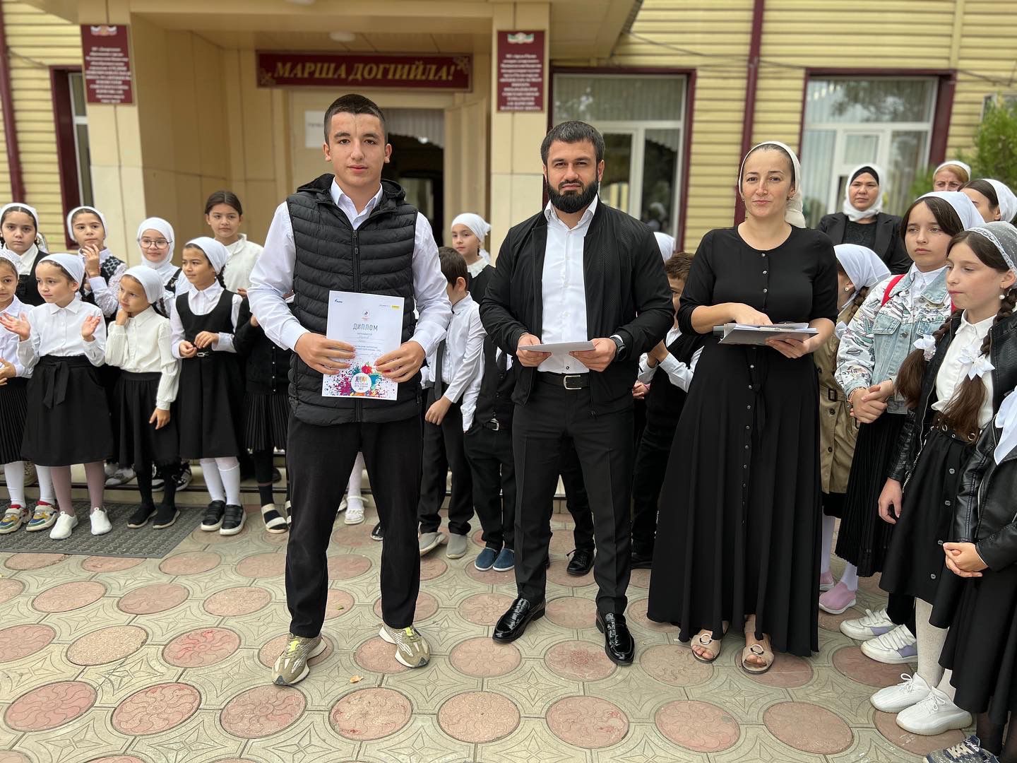 Сегодня в МБОУ «СОШ №1 с.Бердыкель» прошла торжественная церемония поднятия государственных флагов Российской Федерации и Чеченской Республики.
