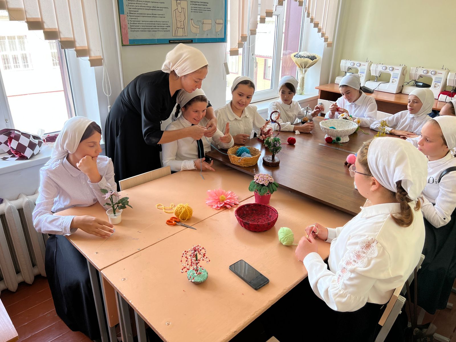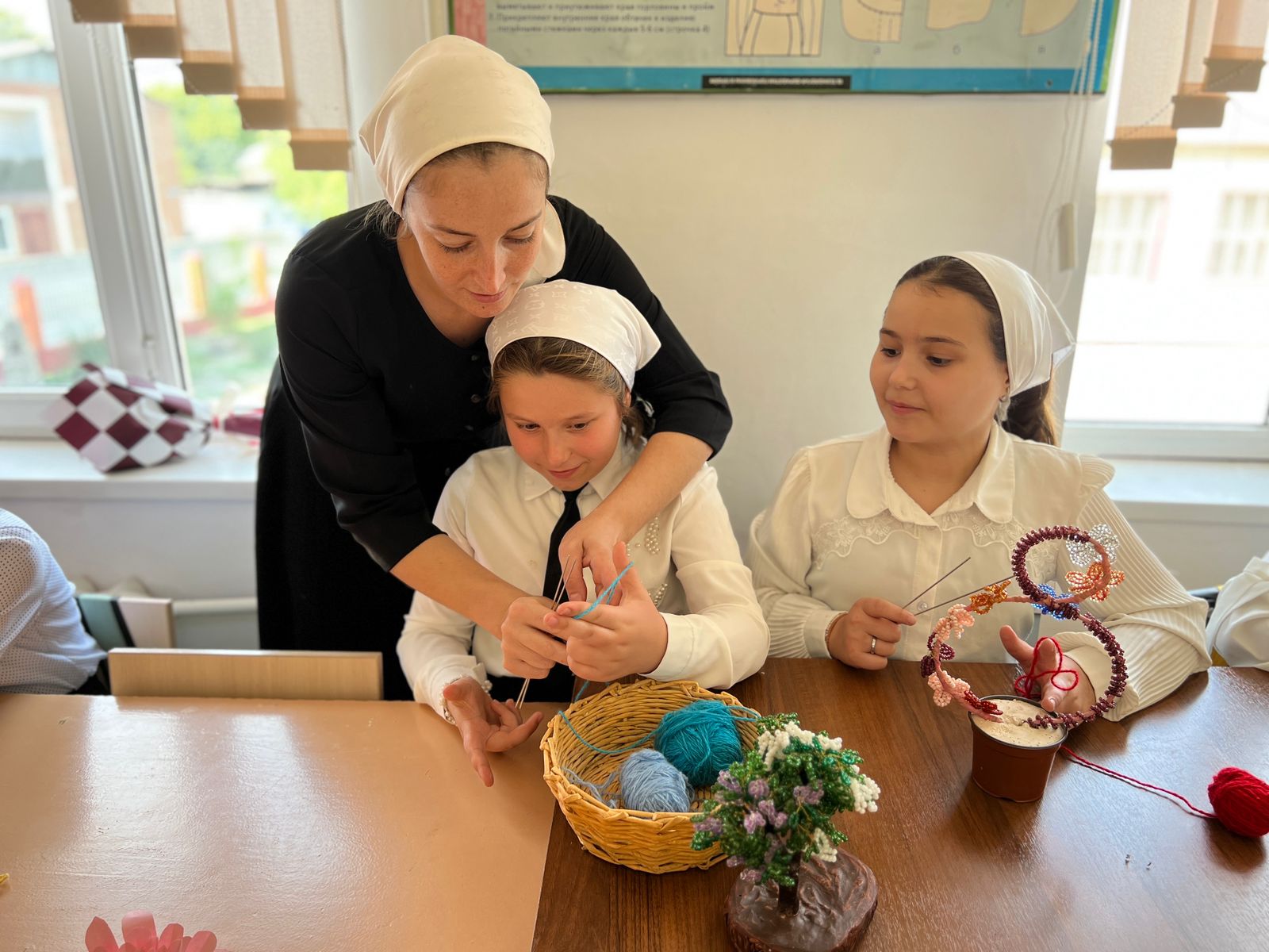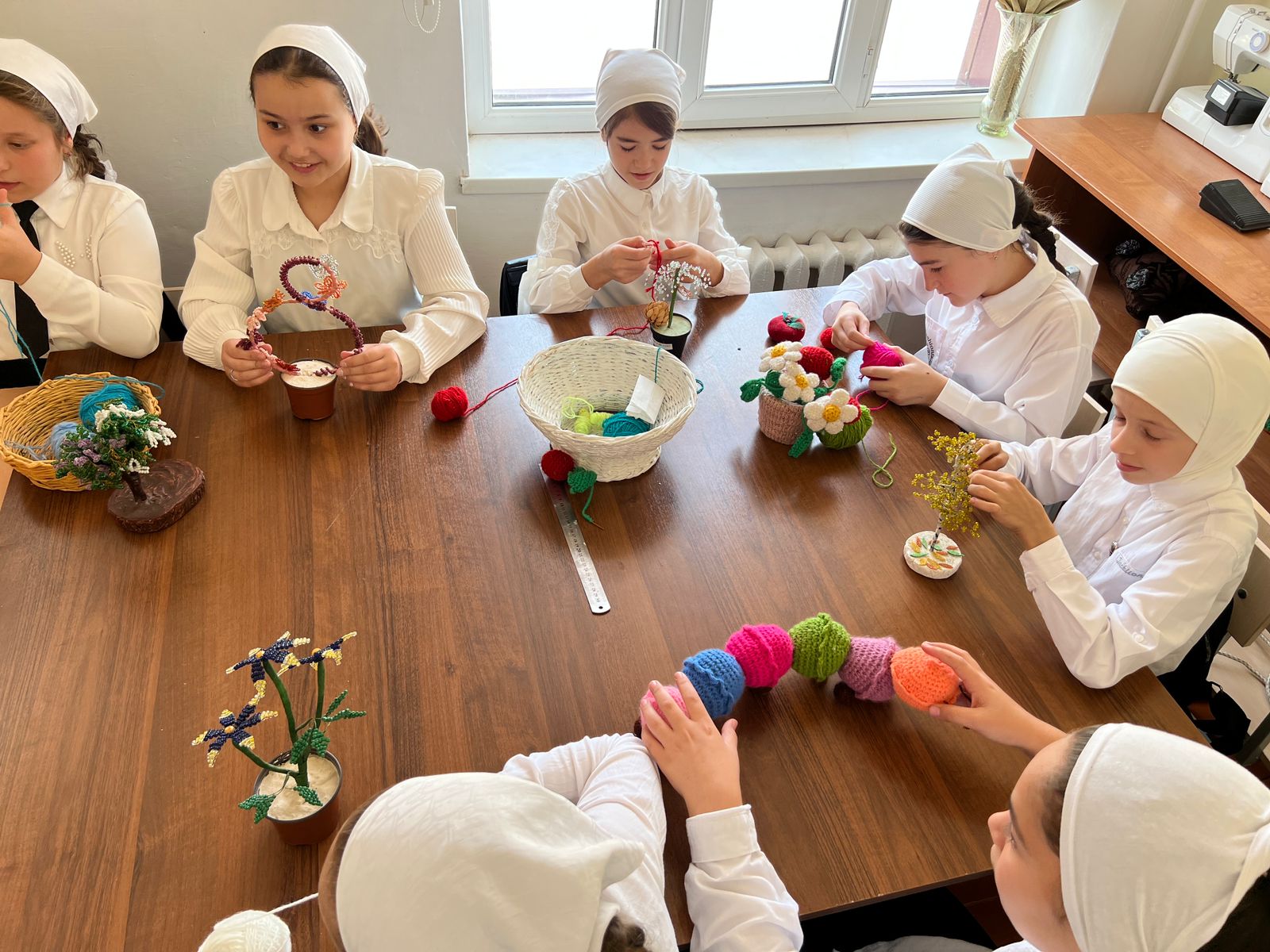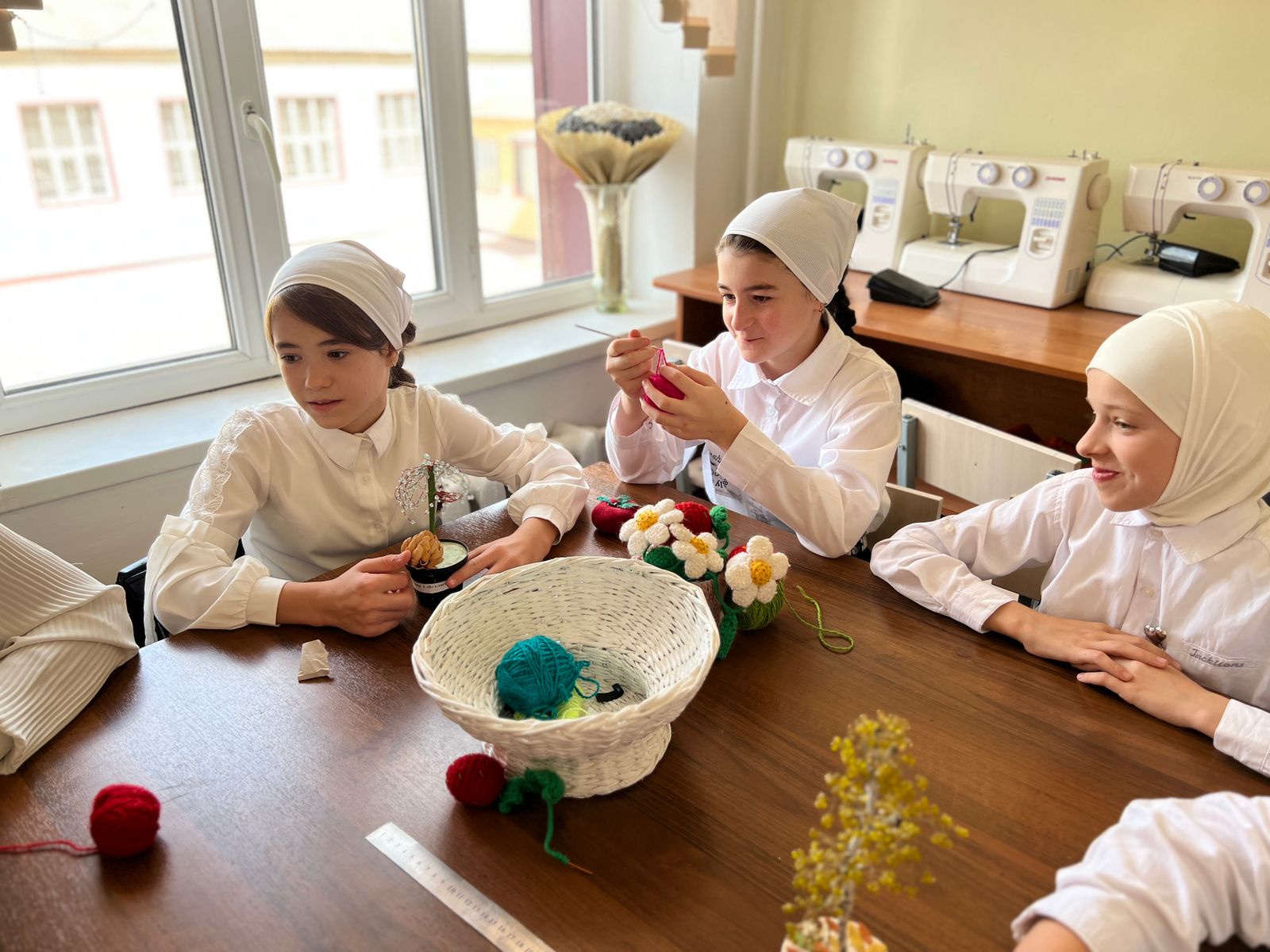 Учитель технологии Кудхаджиева Аминат Вахитовна объяснила девочкам легкие элементы вязания и поделилась основными хитростями этого занимательного и интересного мастерства. И было чему поучиться: одних заинтересовала техника вязания квадратов, другие пробовали вязать салфетки, третьи учились простейшим элементам вязания - столбик с накидом, столбик без накида, полустолбик и так далее.