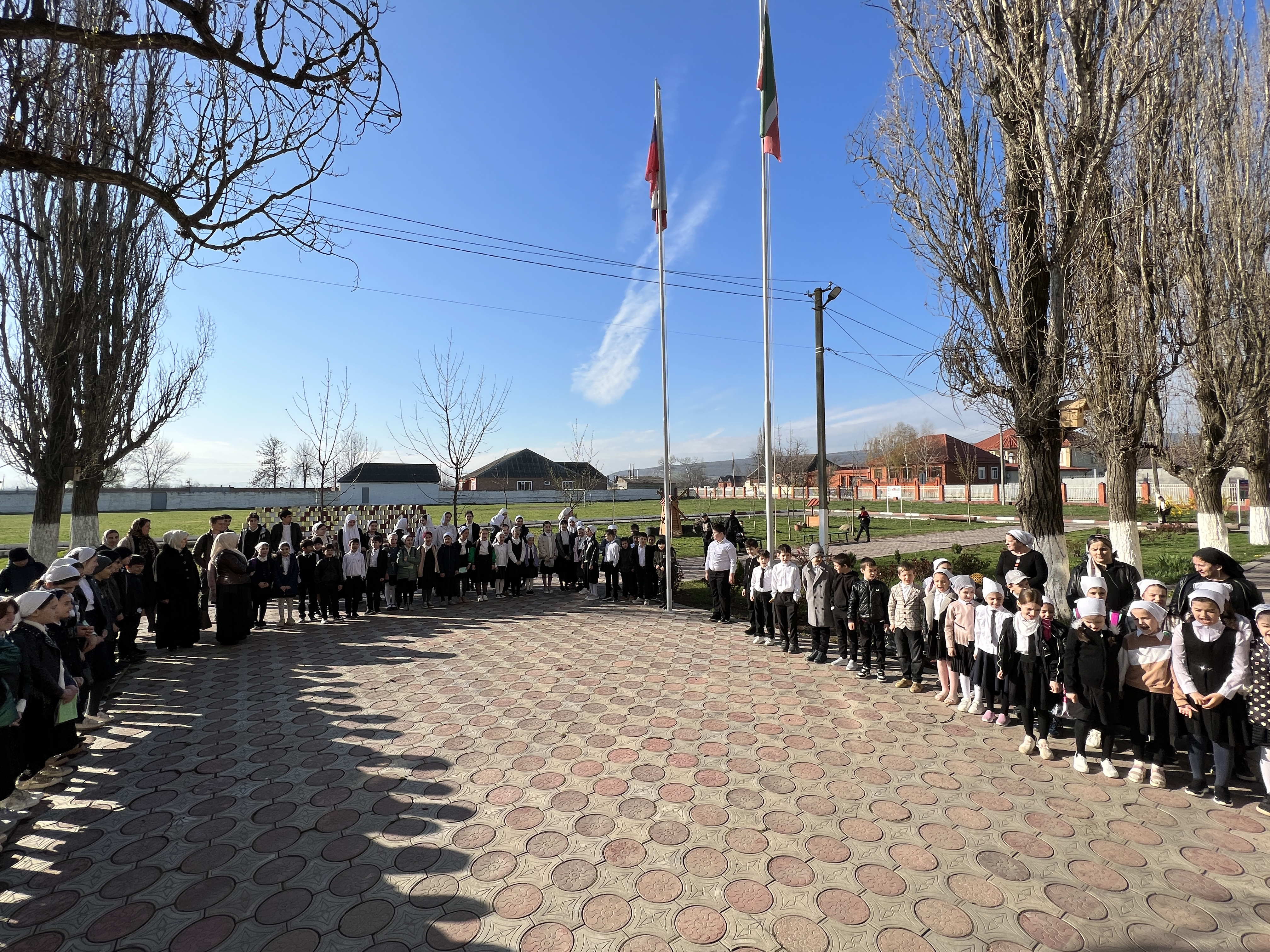 IV-четверть в МБОУ «СОШ №1 с.Бердыкель» началась с традиционной церемонии поднятия государственных флагов Российской Федерации и Чеченской Республики. Ребята исполнили гимны страны и республики.