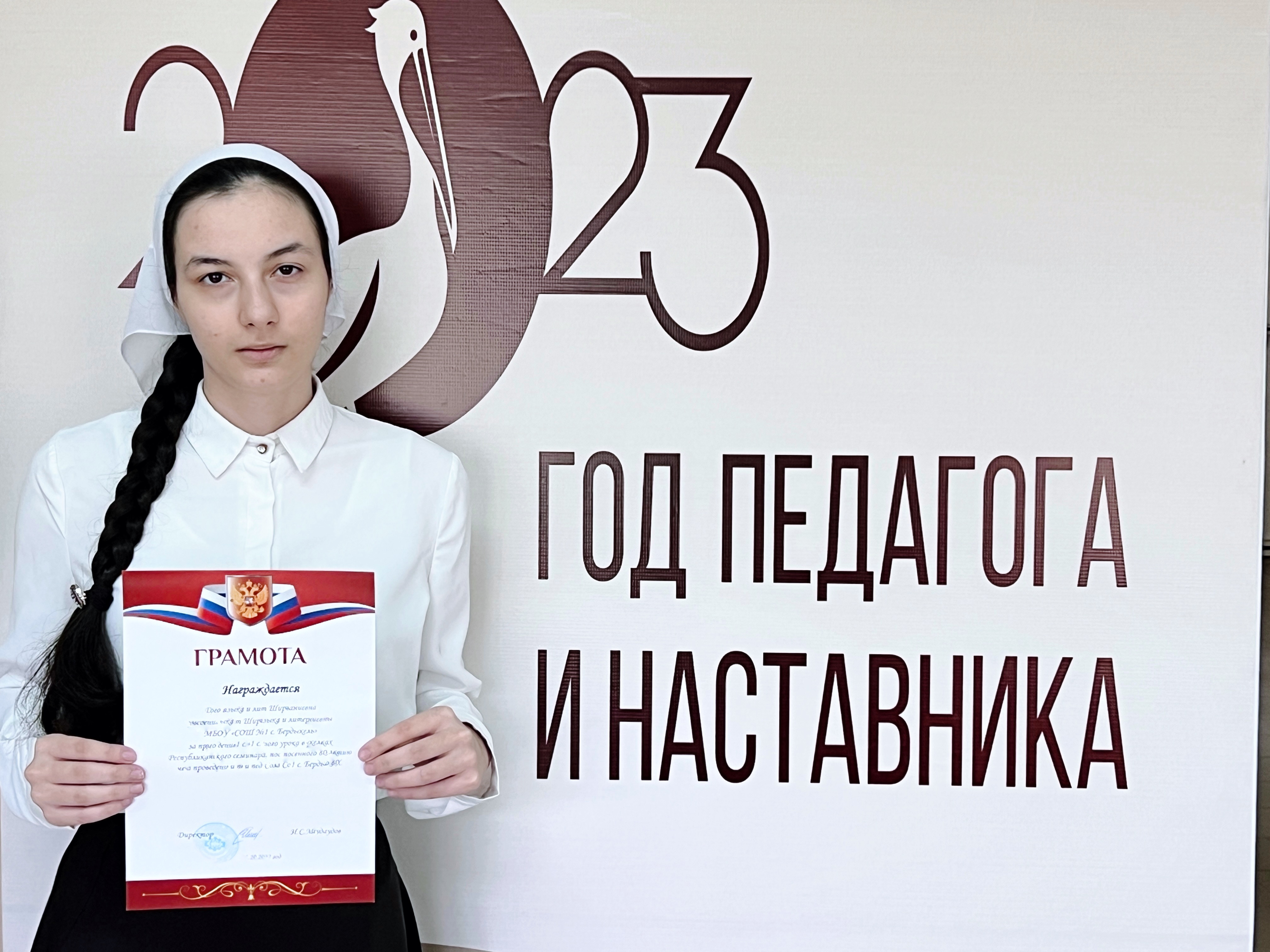 Ученица 10 «Б» класса МБОУ «СОШ №1 с.Бердыкель» Динара Гучигова стала призёром регионального этапа ВсОШ по английскому языку в 2022-2023 учебном году в Чеченской Республике.