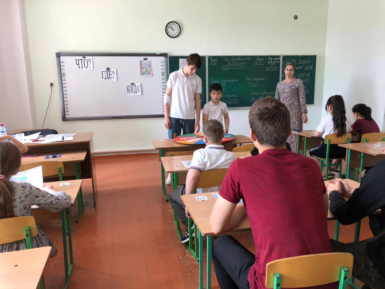 Под традиционную музыкальную заставку игры «Что? Где? Когда?» ребята прошли в кабинет и заняли места за игровым столом. Игра была максимально точно приближена к телевизионной версии: и музыка, и волчок со стрелочкой, и блиц-опрос.