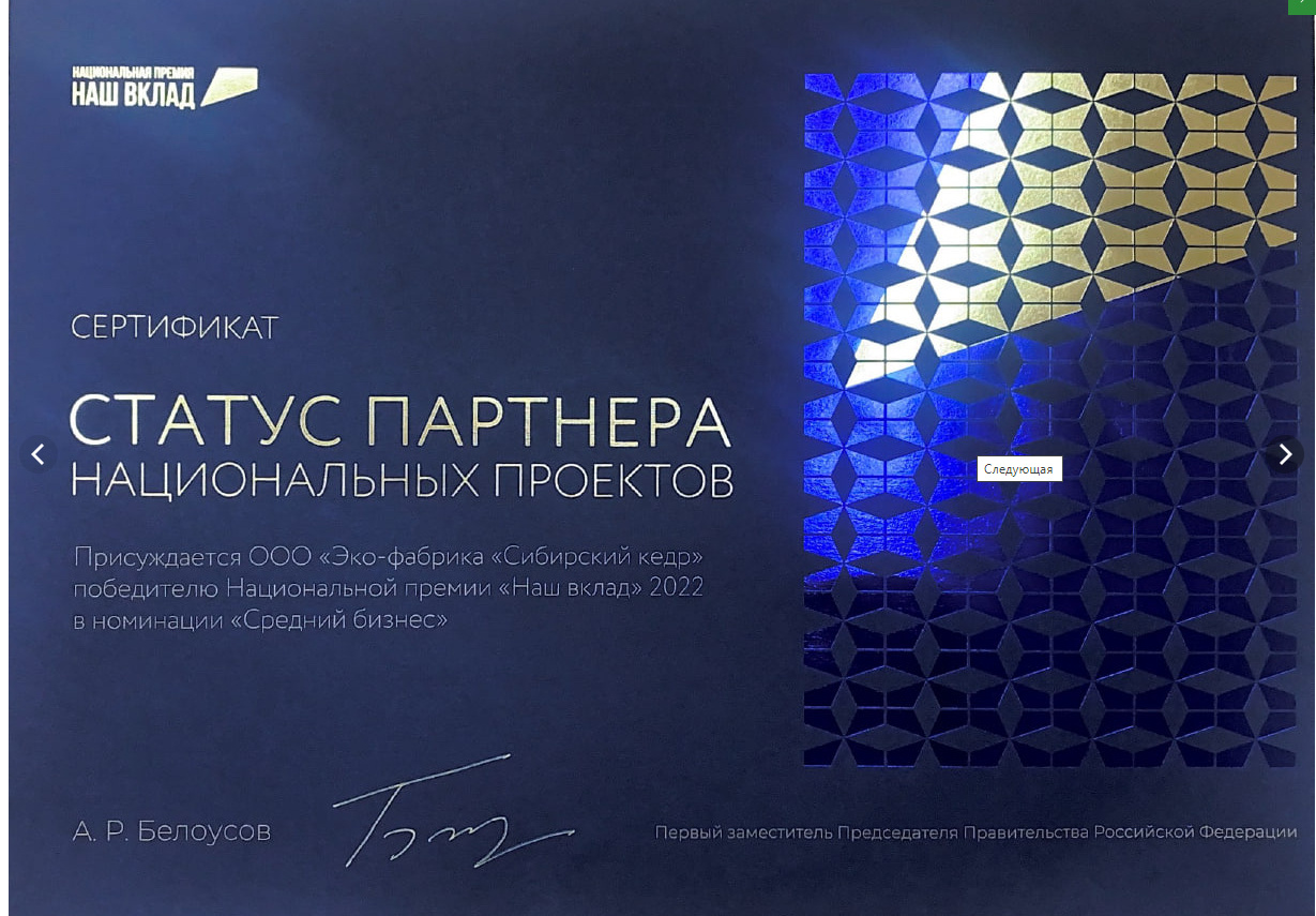 Томская эко-фабрика «Сибирский кедр» стала победителем Национальной премии «Наш вклад»