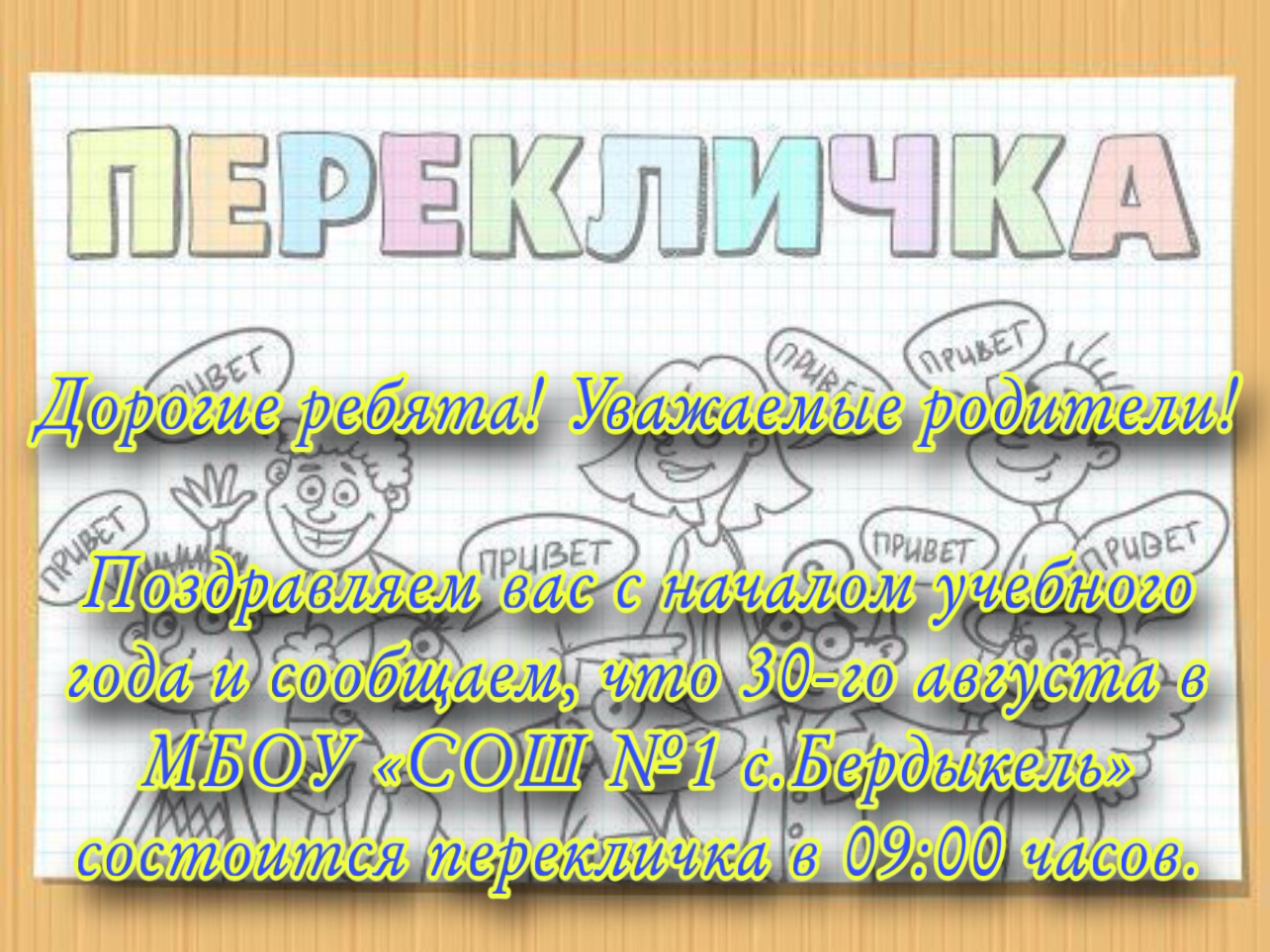 Дорогие ребята! Уважаемые родители! Поздравляем вас с началом учебного года и сообщаем, что 30-го августа в МБОУ «СОШ №1 с.Бердыкель» состоится перекличка в 09:00 часов.