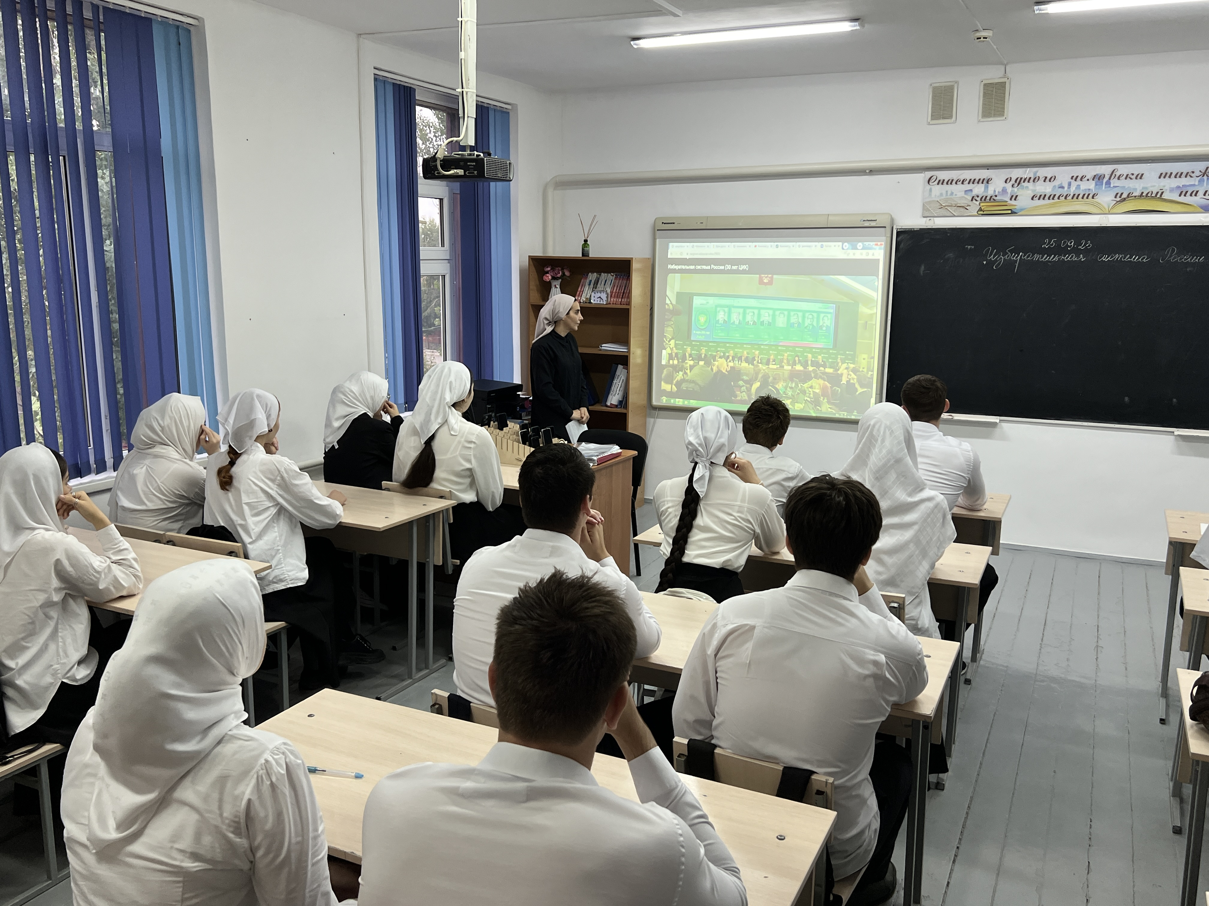 В МБОУ «СОШ №1 с.Бердыкель» прошла традиционная церемония поднятия государственных флагов Российской Федерации и Чеченской Республики. Также прошло внеурочное занятие «Разговоры о важном». Тема урока: «Избирательная комиссия России (30 лет ЦИК)».