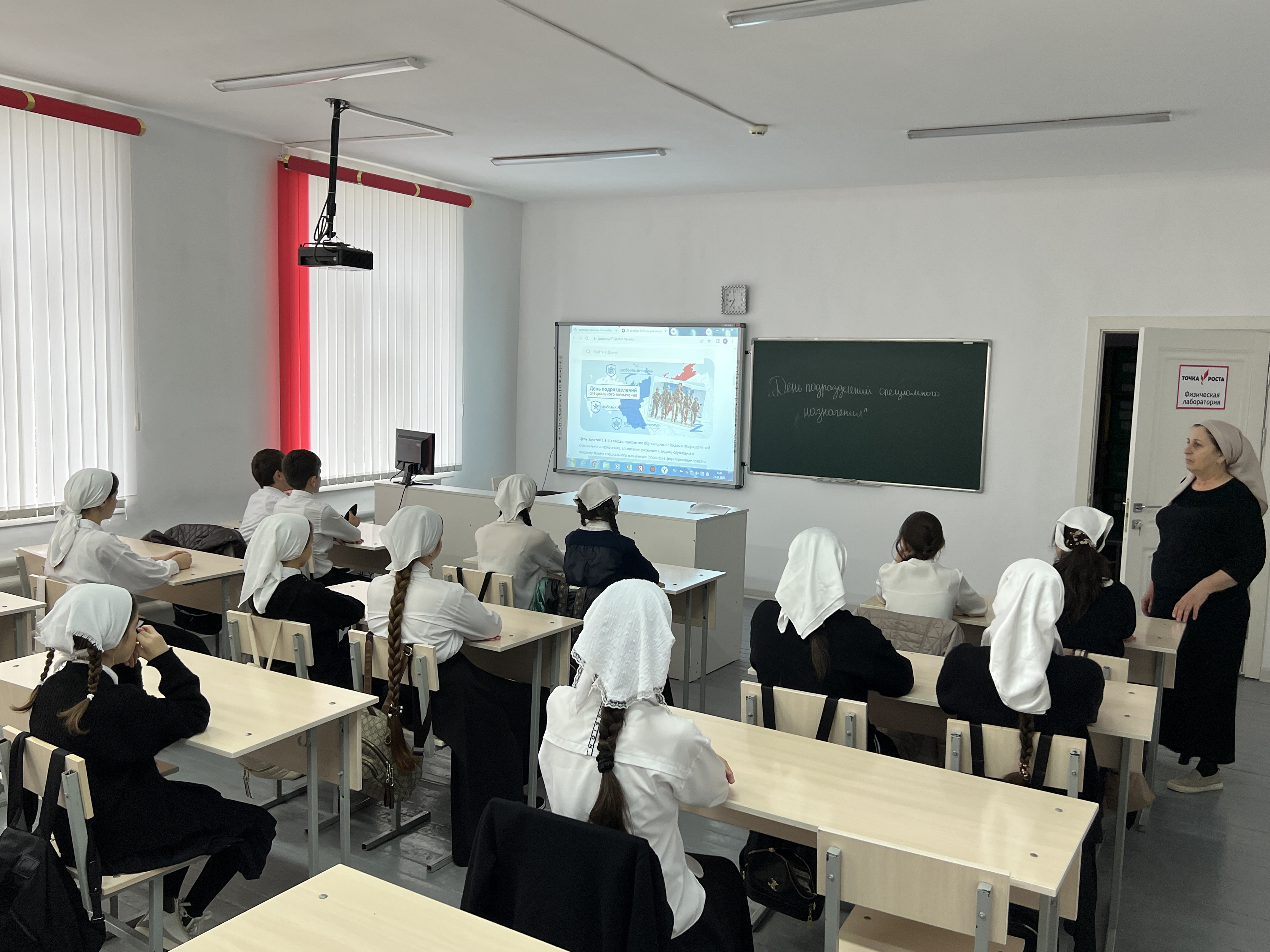 В МБОУ «СОШ №1 с.Бердыкель» прошла традиционная церемония поднятия государственных флагов Российской Федерации и Чеченской Республики. Прошло и внеурочное занятие «Разговоры о важном». Тема урока: «День подразделений специального назначения».