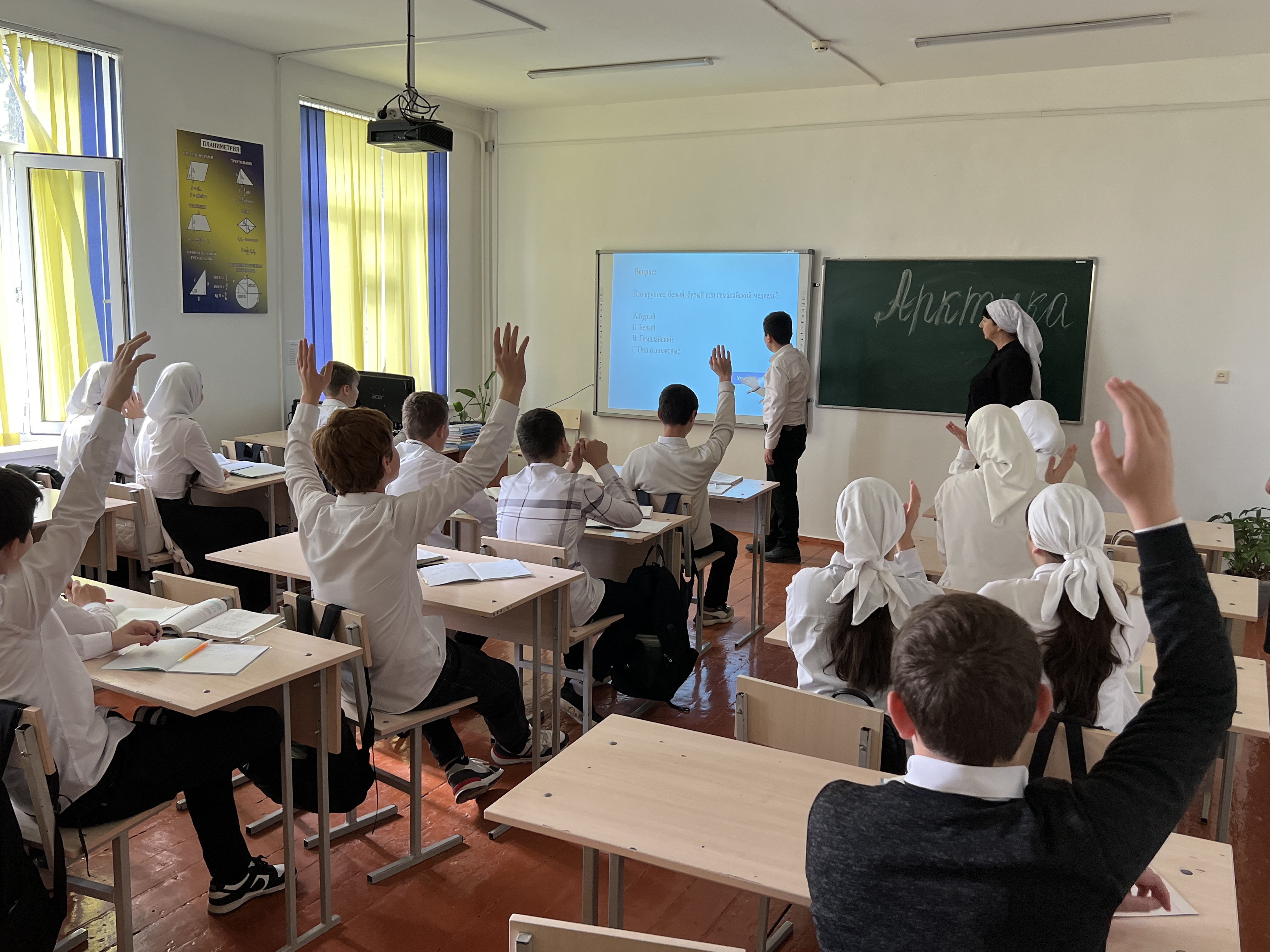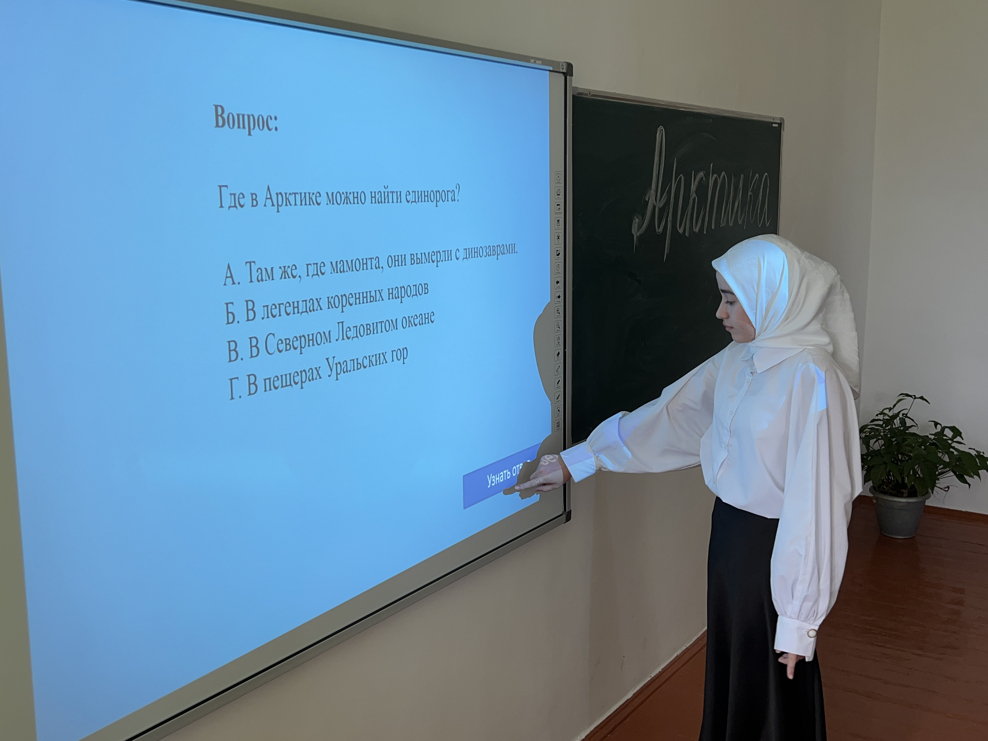 В МБОУ «СОШ №1 с.Бердыкель» прошел Всероссийский урок «Арктика». Урок включал в себя видеоролики, презентации, методические материалы, интерактивную игру-викторину.