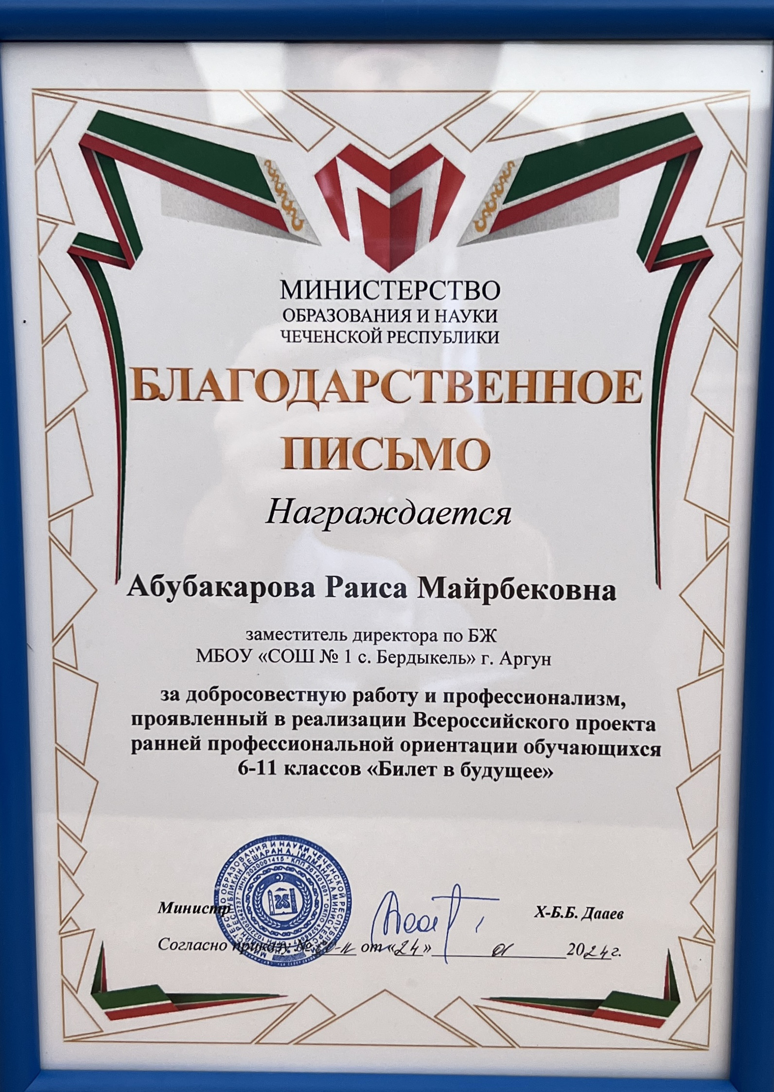 Заместитель директора по БЖ МБОУ «СОШ №1 с.Бердыкель» Абубакарова Раиса Майрбековна получила благодарственное письмо из рук министра образования и науки Чеченской Республики.