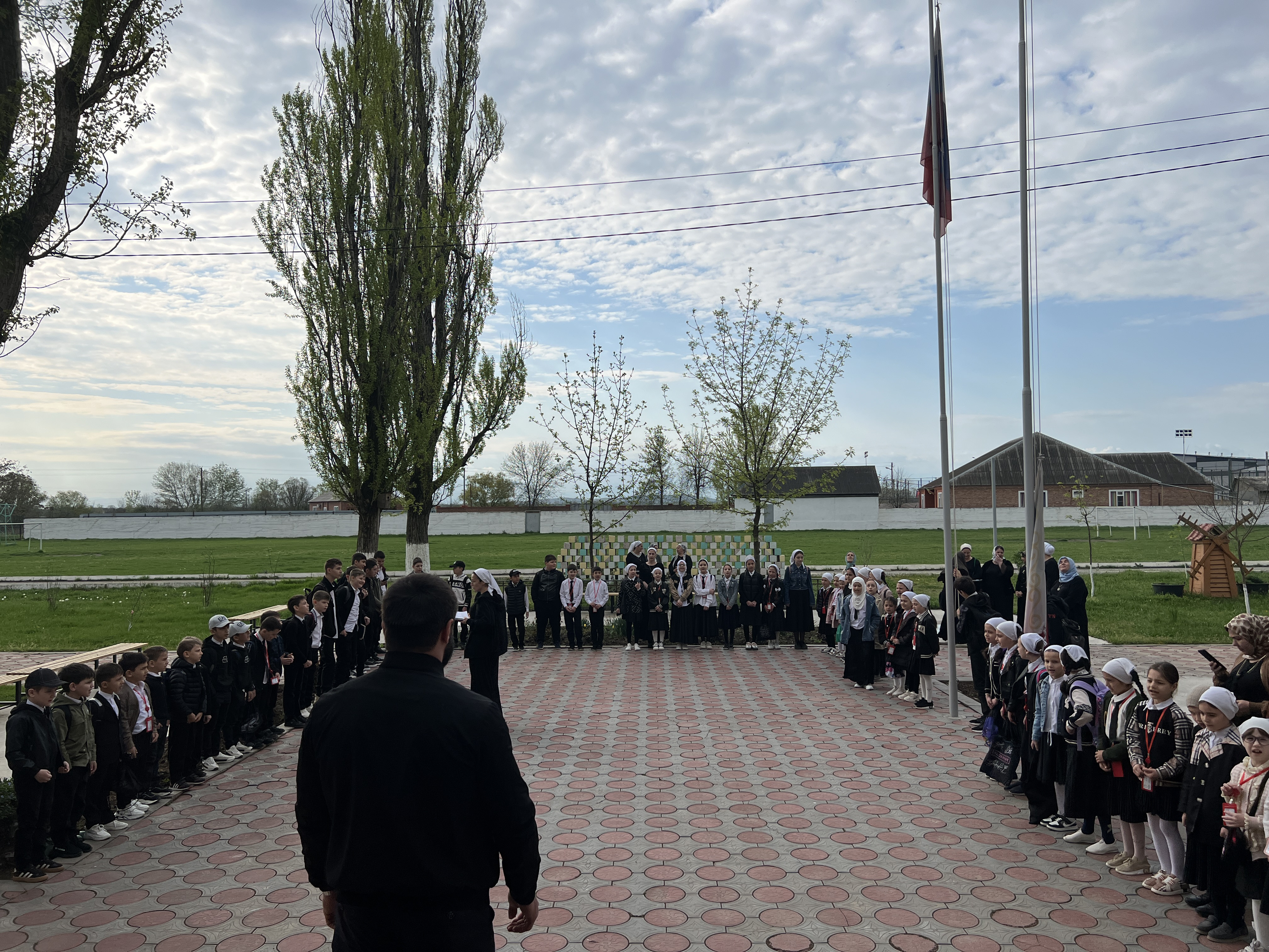 В МБОУ «СОШ №1 с.Бердыкель» прошла традиционная церемония поднятия государственных флагов Российской Федерации и Чеченской Республики. Также прошло и внеурочное занятие «Разговоры о важном». Тема урока: «215 лет со дня рождения Н.В.Гоголя».