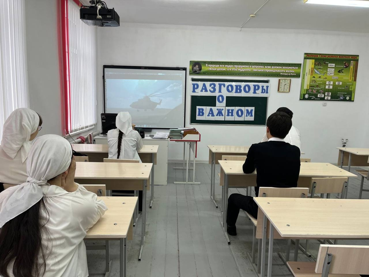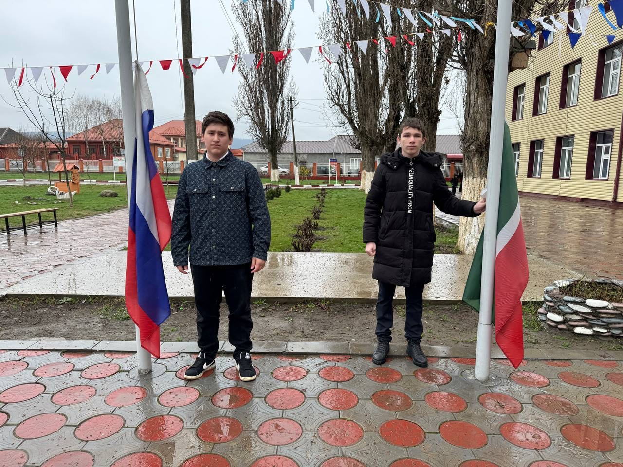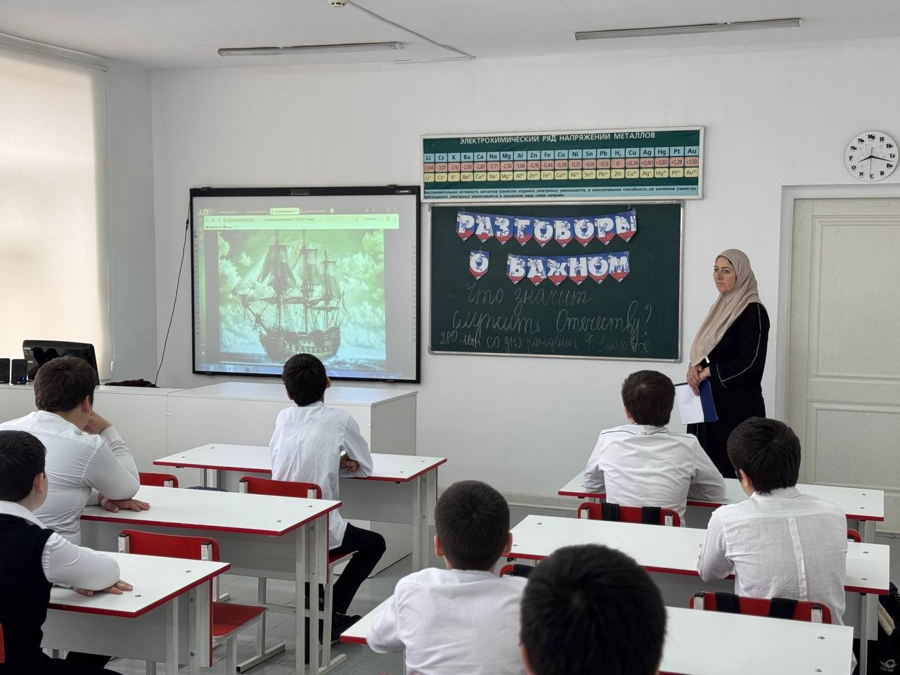 Понедельник по традиции в МБОУ «СОШ №1 с. Бердыкель» начался с церемонии поднятия флагов Российской Федерации и Чеченской Республики. Прошло и внеурочное занятие «Разговоры о важном» на тему «Что значит служить Отечеству? 280 лет со дня рождения Ф. Ушакова».