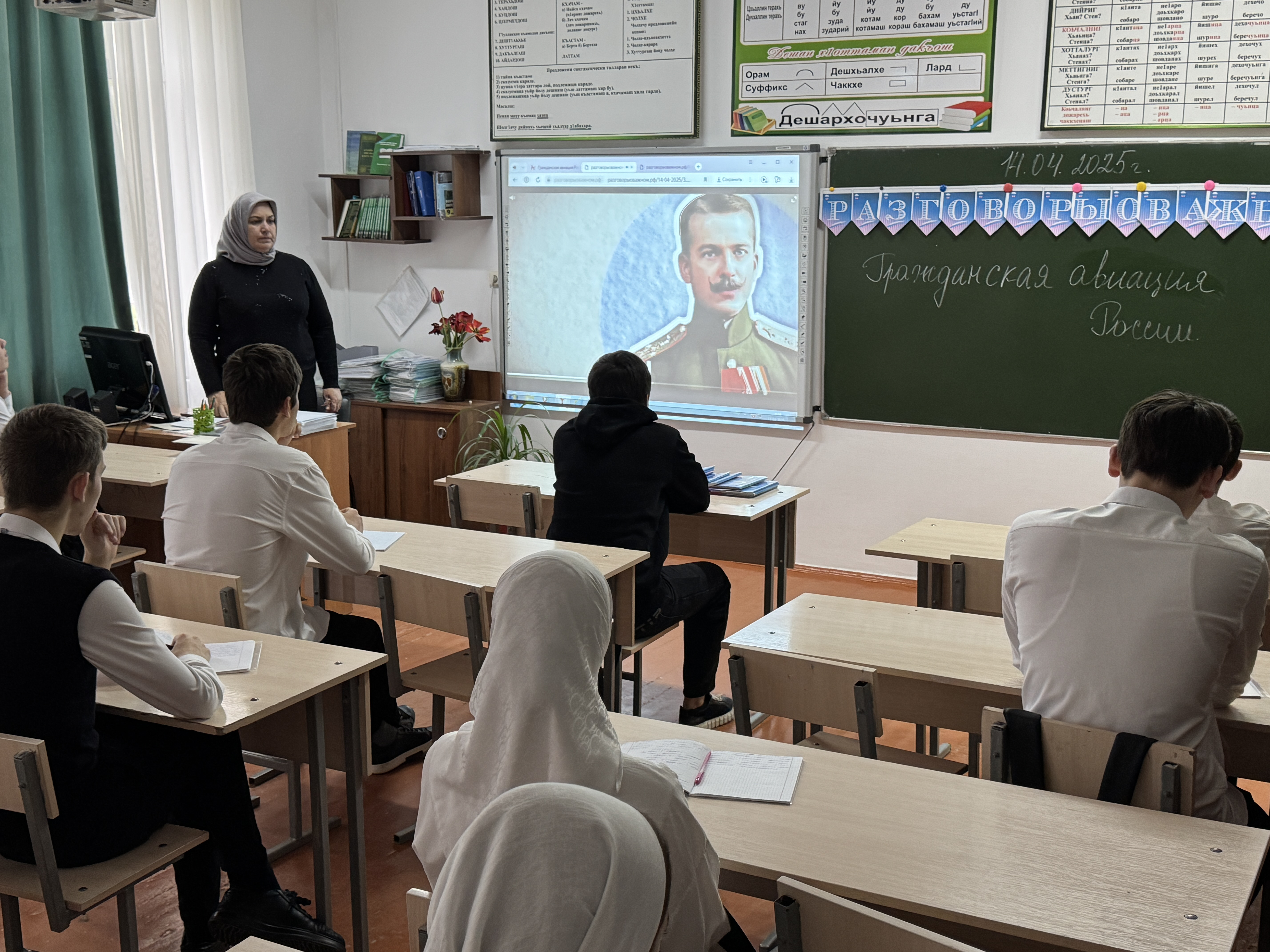 Понедельник по традиции в МБОУ «СОШ №1 с. Бердыкель» начался с церемонии поднятия флагов Российской Федерации и Чеченской Республики. Прошло и внеурочное занятие «Разговоры о важном» на тему «Гражданская авиация России».