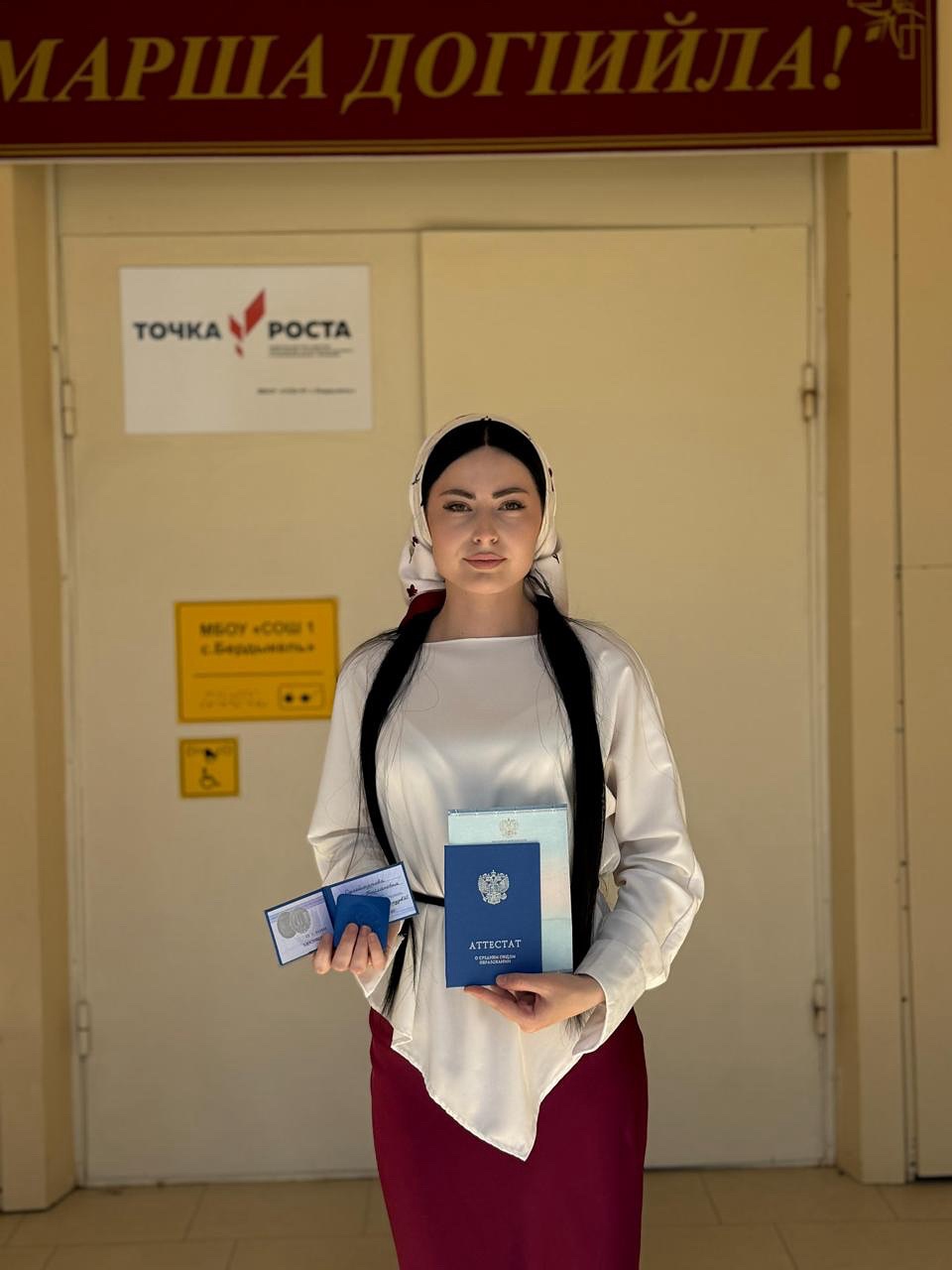 Выпускница 11 «А» класса МБОУ «СОШ №1 с. Бердыкель» Сулейманова Марьям с успехом окончила школу с отличием и заслуженно получила серебряную медаль