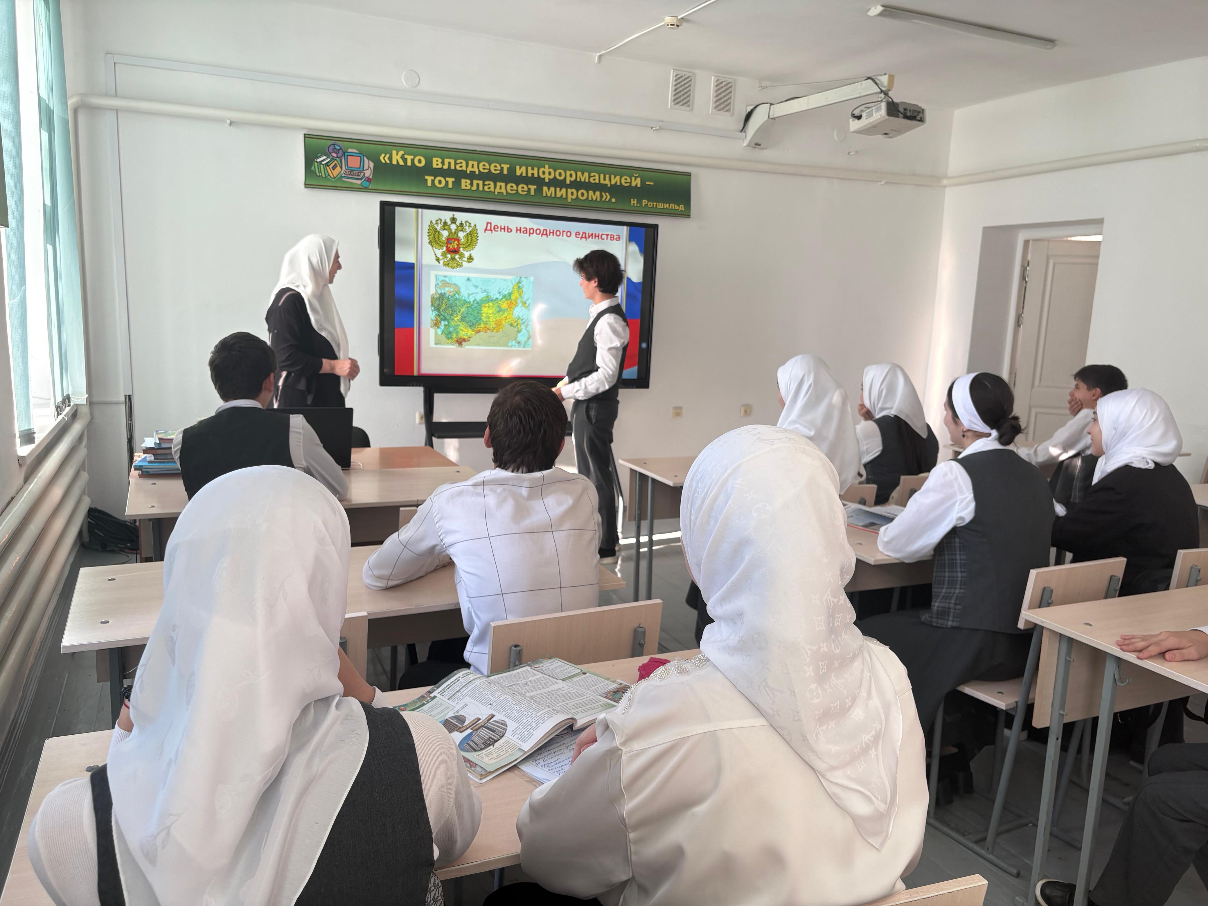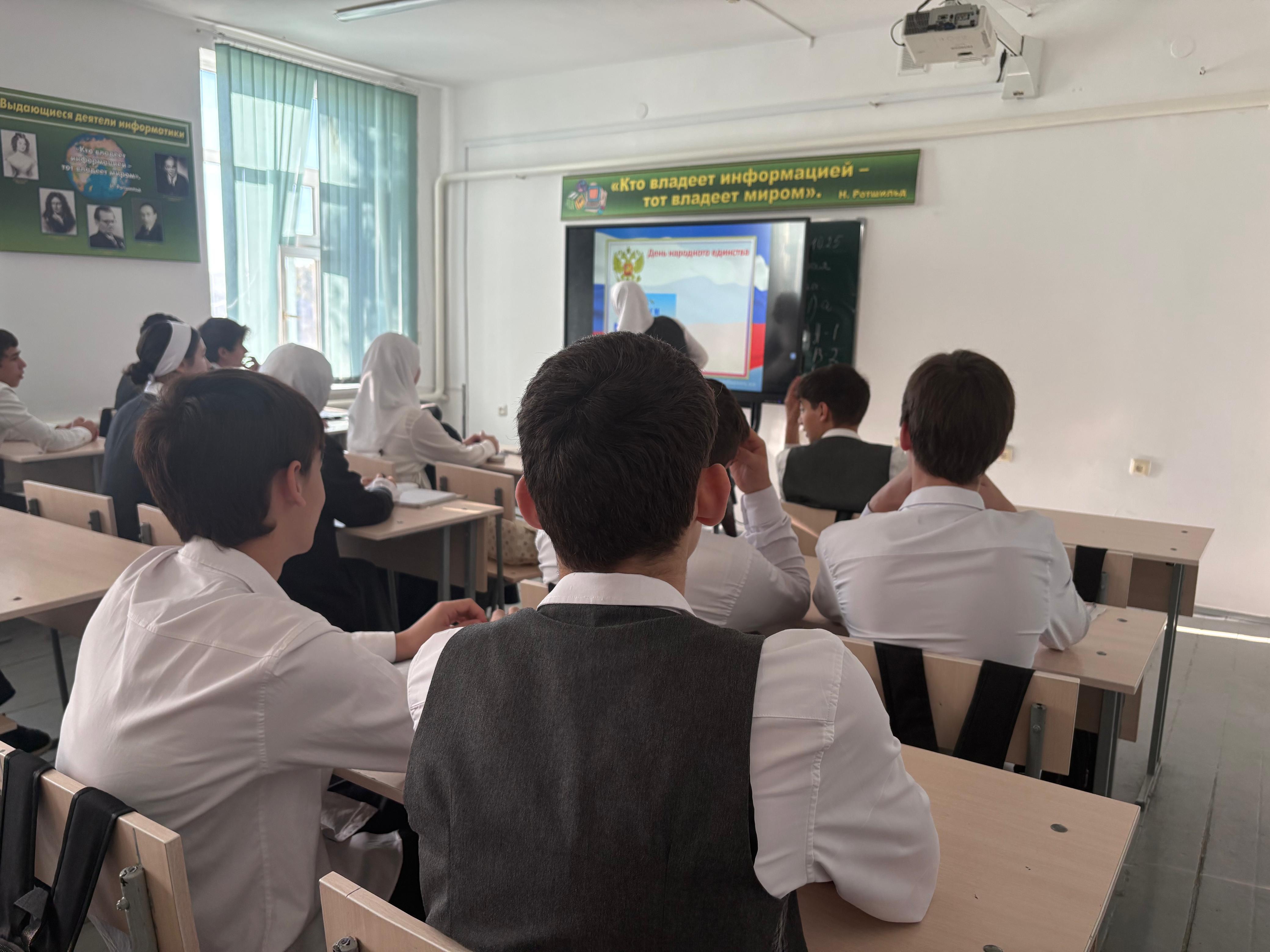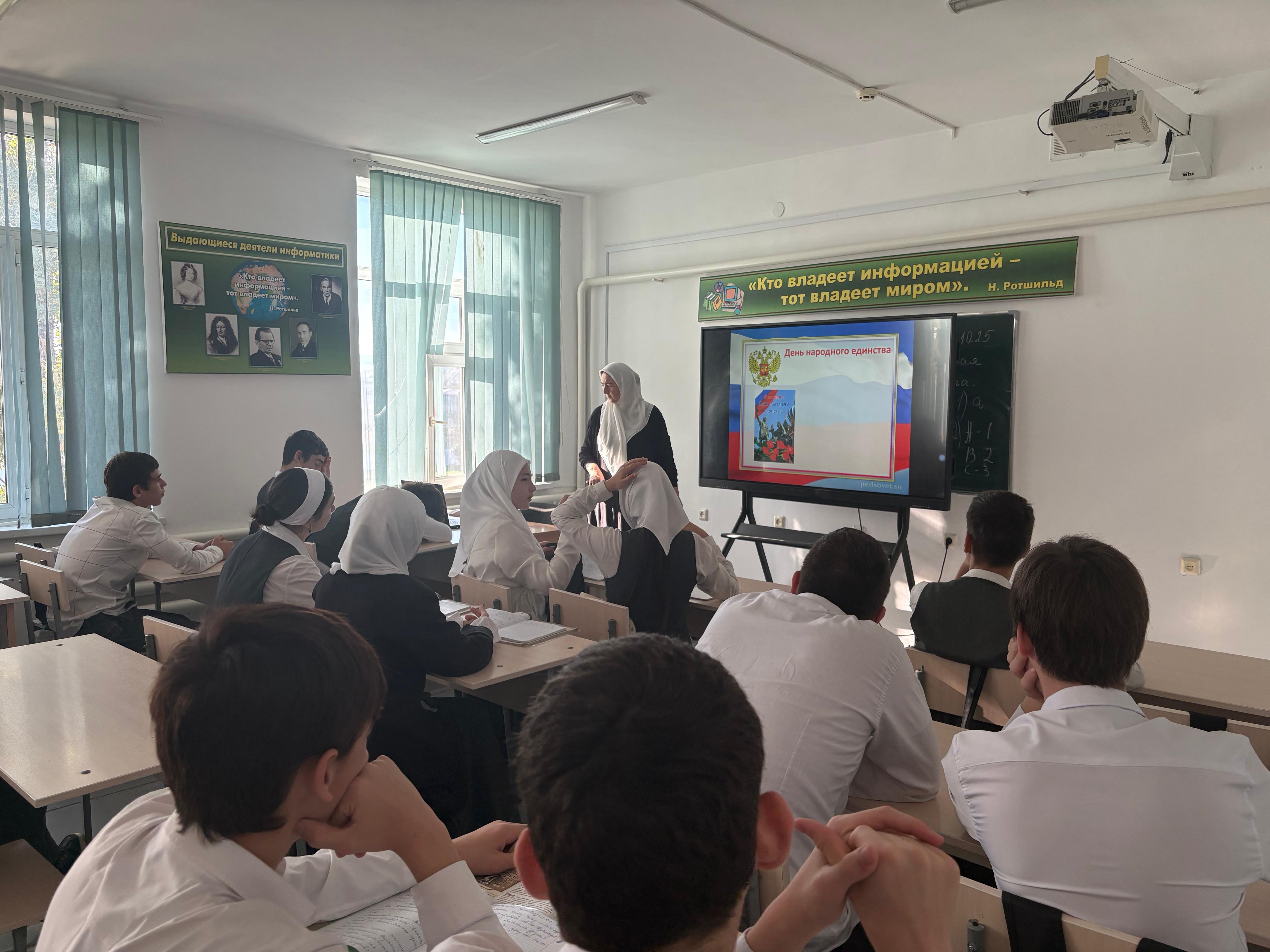В МБОУ «СОШ №1 с. Бердыкель» прошли классные часы, посвящённые Дню народного единства. Ребята вспомнили историю праздника, поговорили о значении единства народов России и обсудили, почему важно сохранять взаимопонимание и уважение между людьми разных национальностей. Мероприятие прошло в тёплой и дружеской атмосфере.