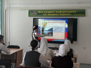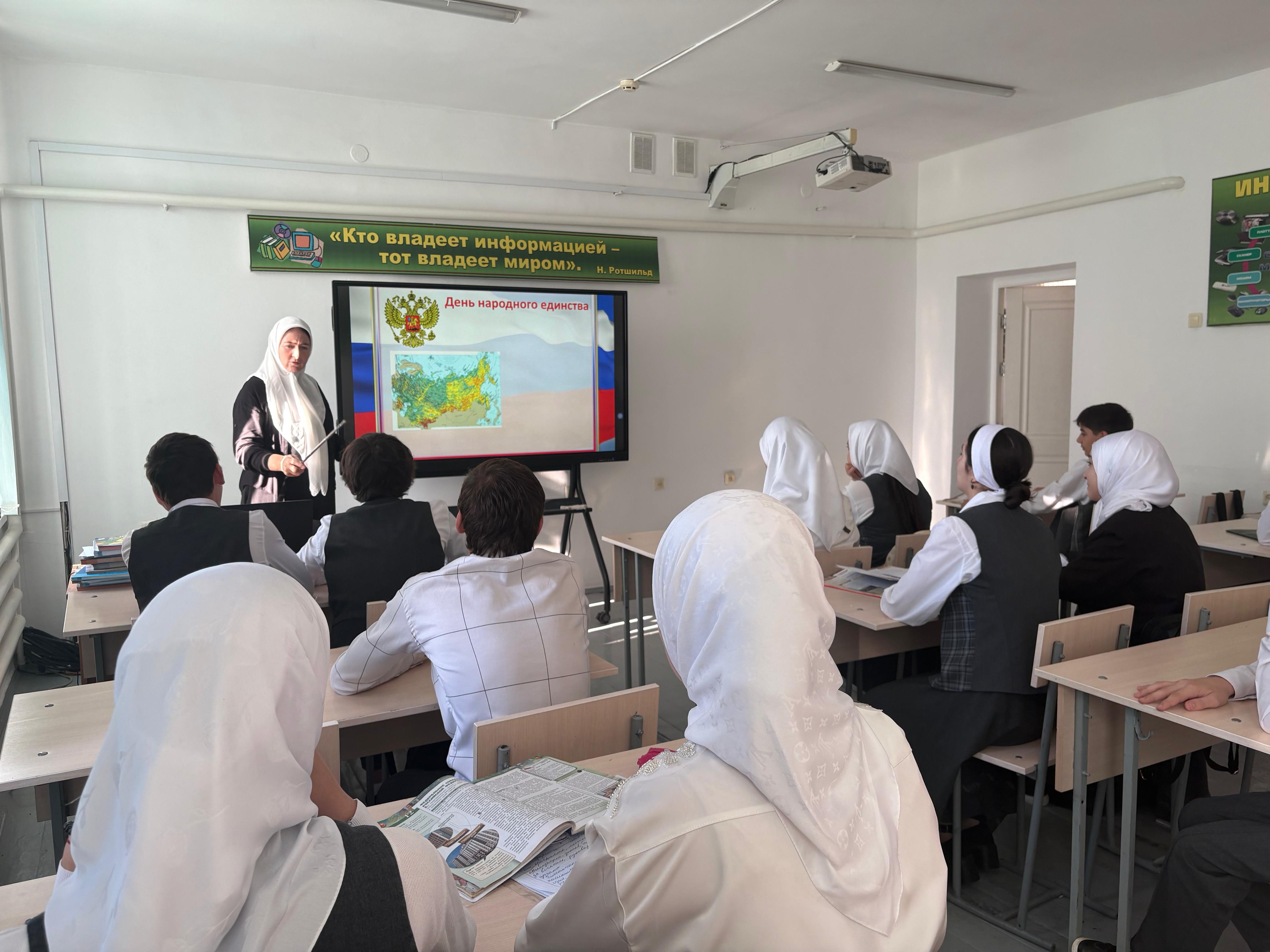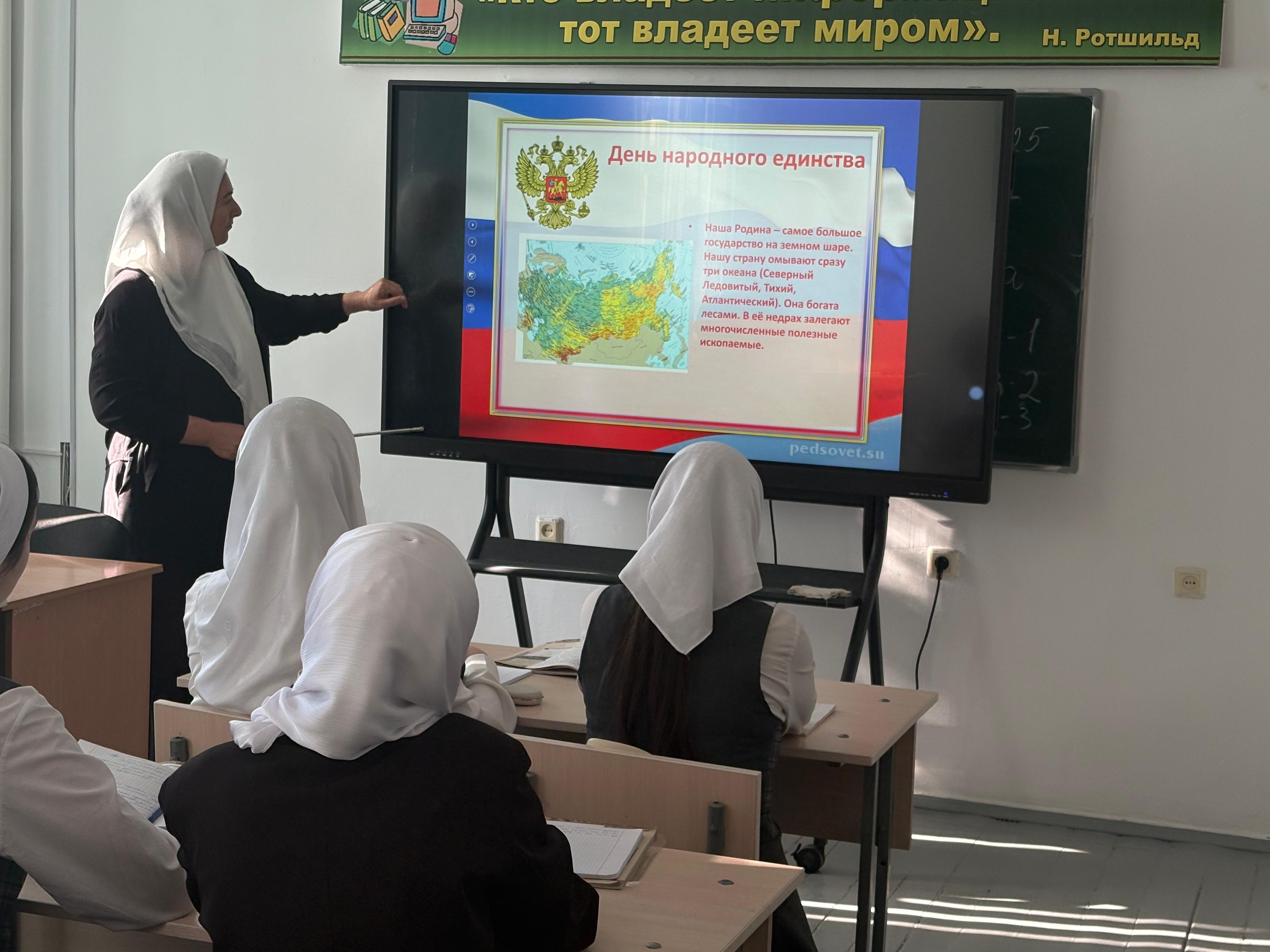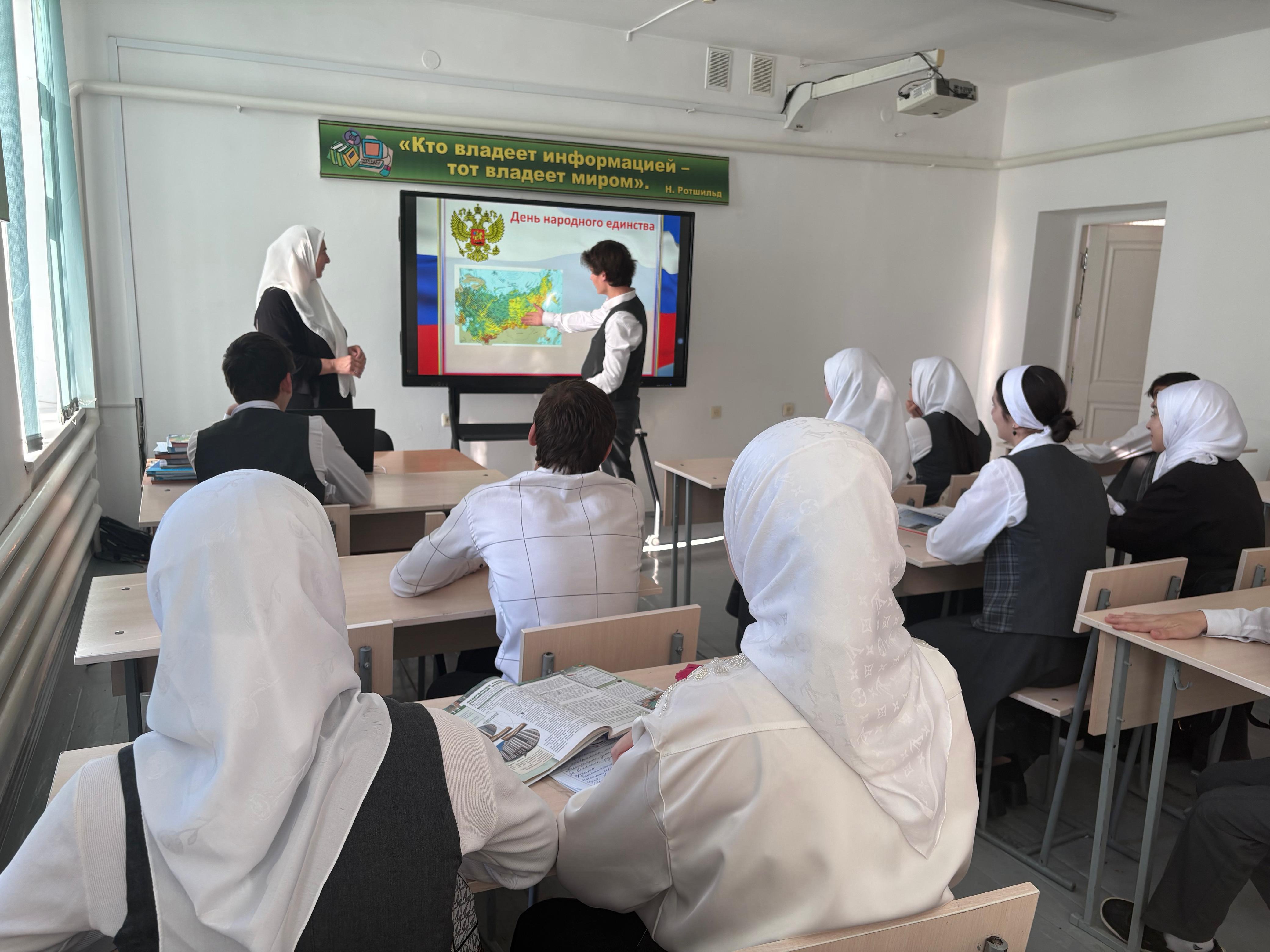 В МБОУ «СОШ №1 с. Бердыкель» прошли классные часы, посвящённые Дню народного единства. Ребята вспомнили историю праздника, поговорили о значении единства народов России и обсудили, почему важно сохранять взаимопонимание и уважение между людьми разных национальностей. Мероприятие прошло в тёплой и дружеской атмосфере.