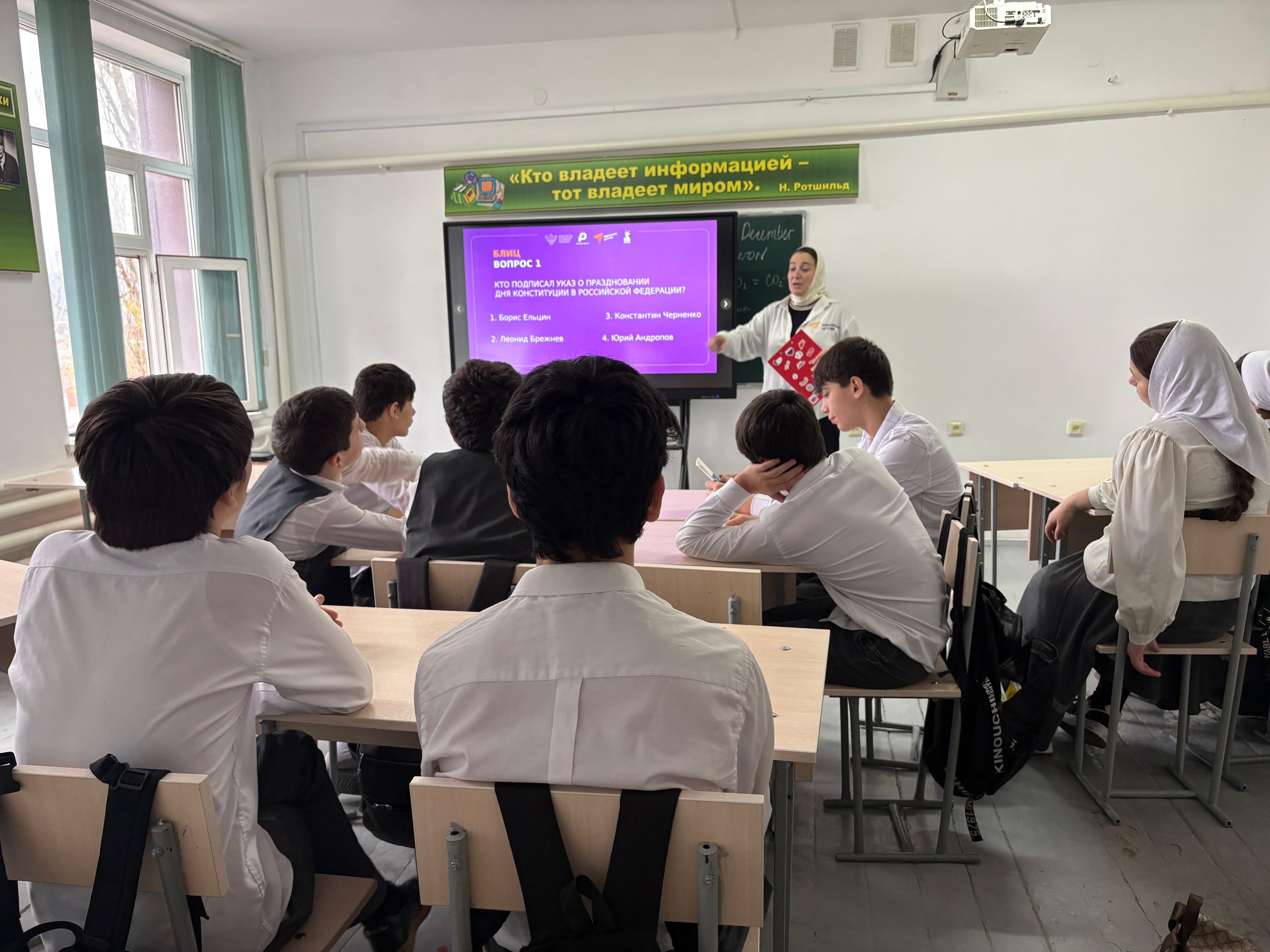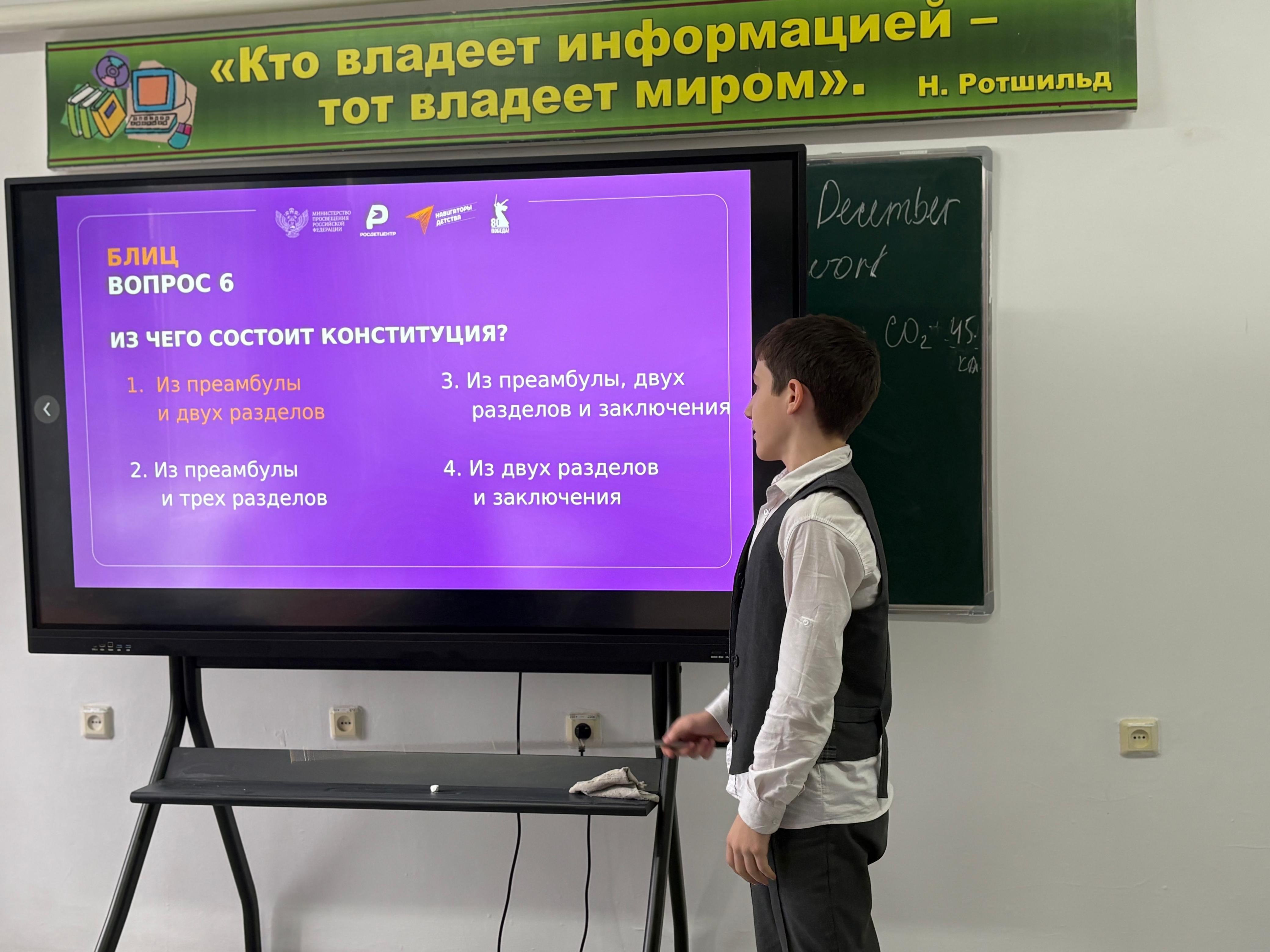 В МБОУ «СОШ №1 с. Бердыкель» прошёл яркий и познавательный брэйн-ринг, посвящённый Дню Конституции Российской Федерации. Ученики активно участвовали в соревновании, демонстрируя знание правовых основ и исторических фактов. Это мероприятие способствовало развитию у ребят чувства гордости за свою страну и пониманию роли основного закона в жизни российского общества.